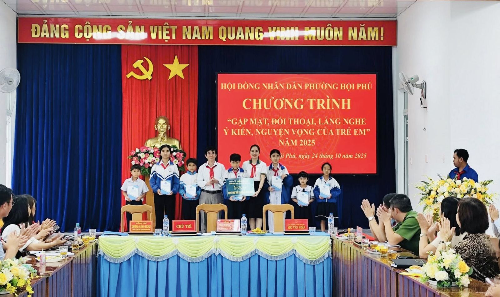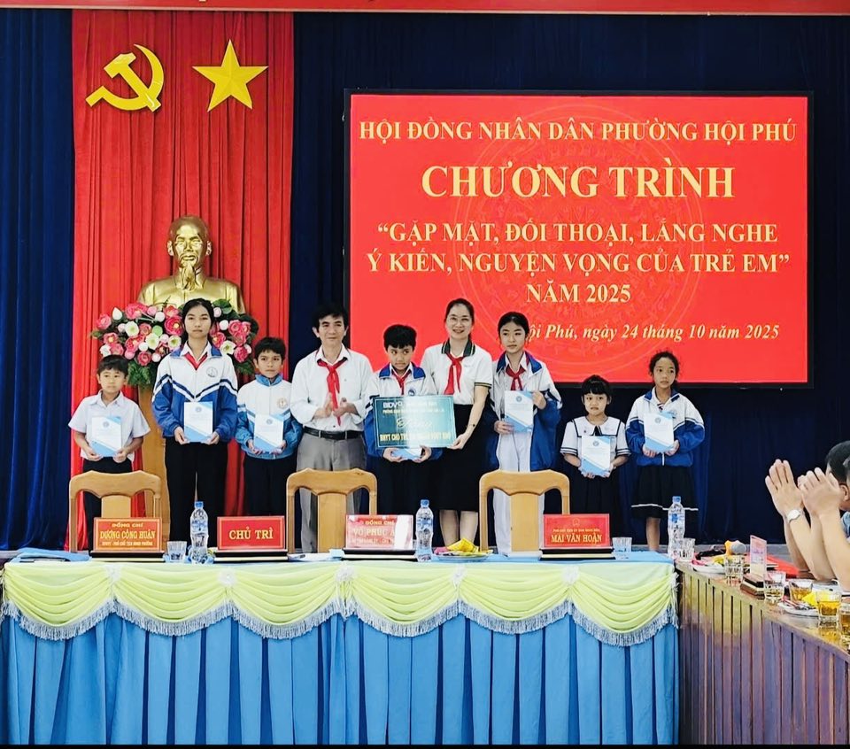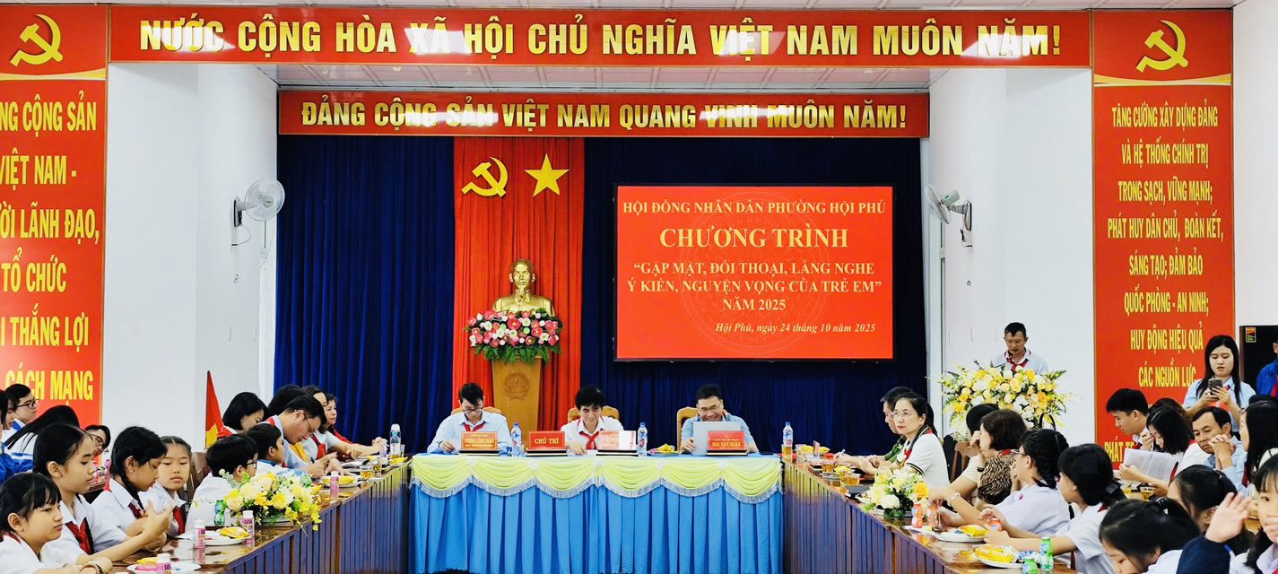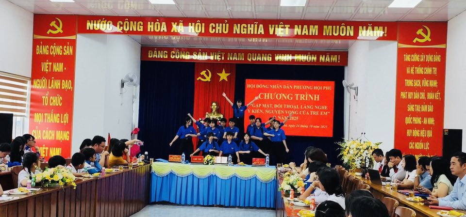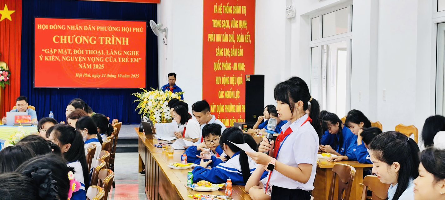 Ngày 24/10/2025, HĐND phường Hội Phú tổ chức Chương trình gặp mặt, đối thoại, lắng nghe ý kiến nguyện vọng của trẻ em năm 2025. Tham dự chương trình có đồng chí: Võ Phúc Ánh - Bí thư Đảng ủy, Chủ tịch HĐND phường, đồng chí Dương Công Huân - Phó Chủ tịch HĐND phường, đồng chí Mai Văn Hoàn - Phó Chủ tịch UBND phường chủ trì Chương trình. Cùng dự còn có đại diện lãnh đạo các cơ quan tham mưu giúp việc Đảng ủy, các ban, ngành, Mặt trận và các tổ chức chính trị - xã hội phường; Ban giám hiệu các trường học trên địa bàn và sự có mặt của 70 em học sinh đại diện cho hơn 7.000 thanh thiếu niên học sinh.