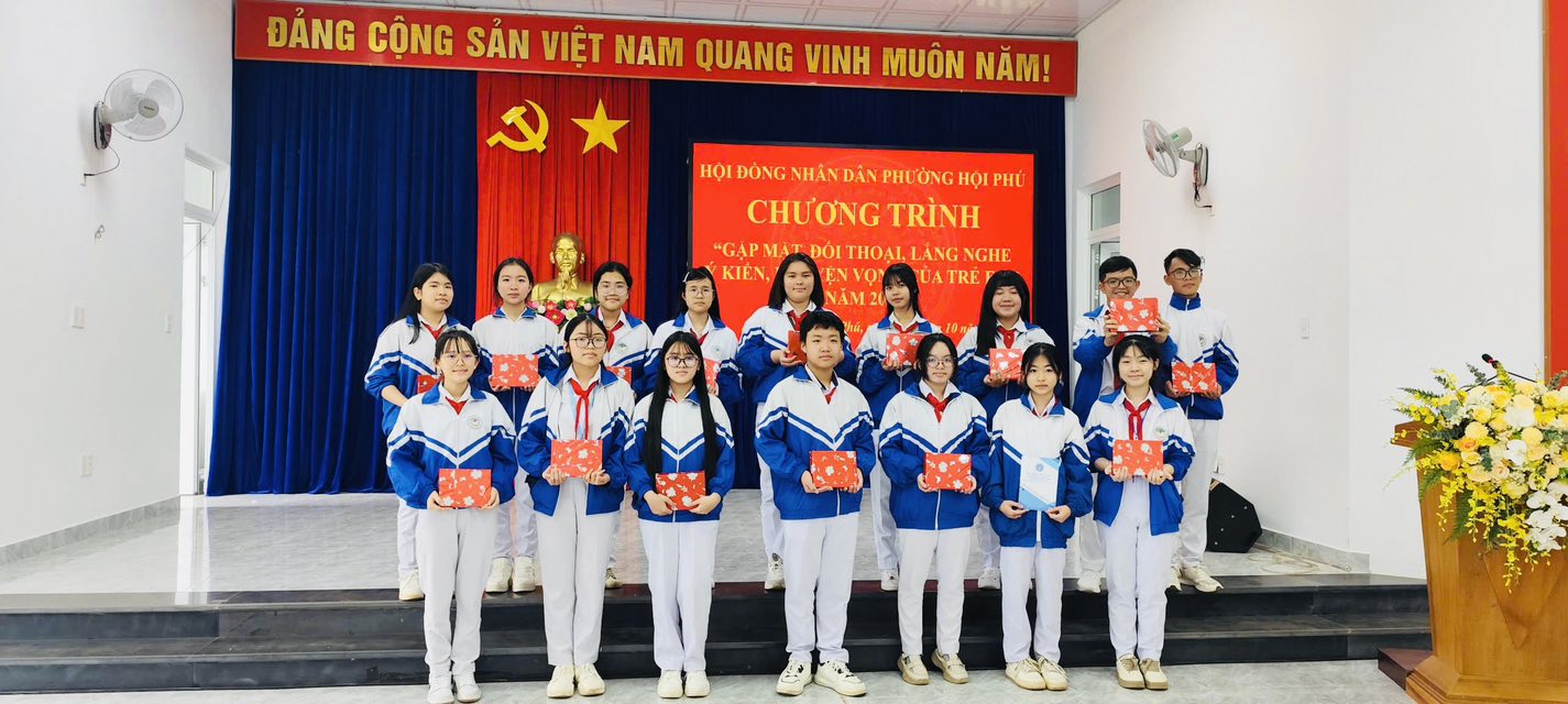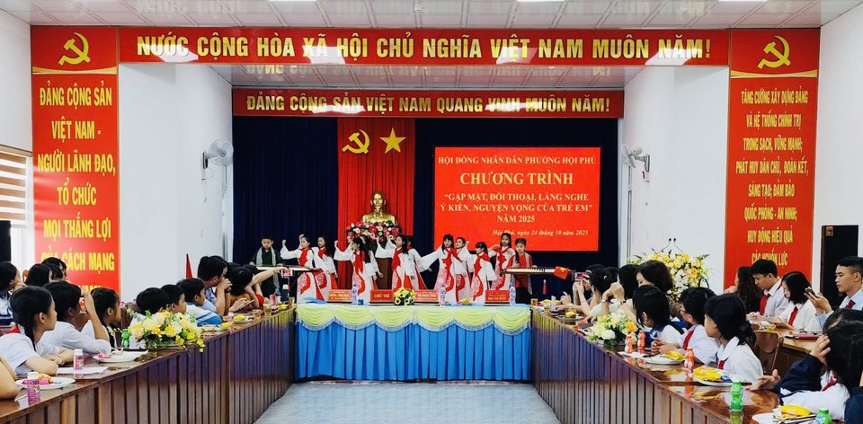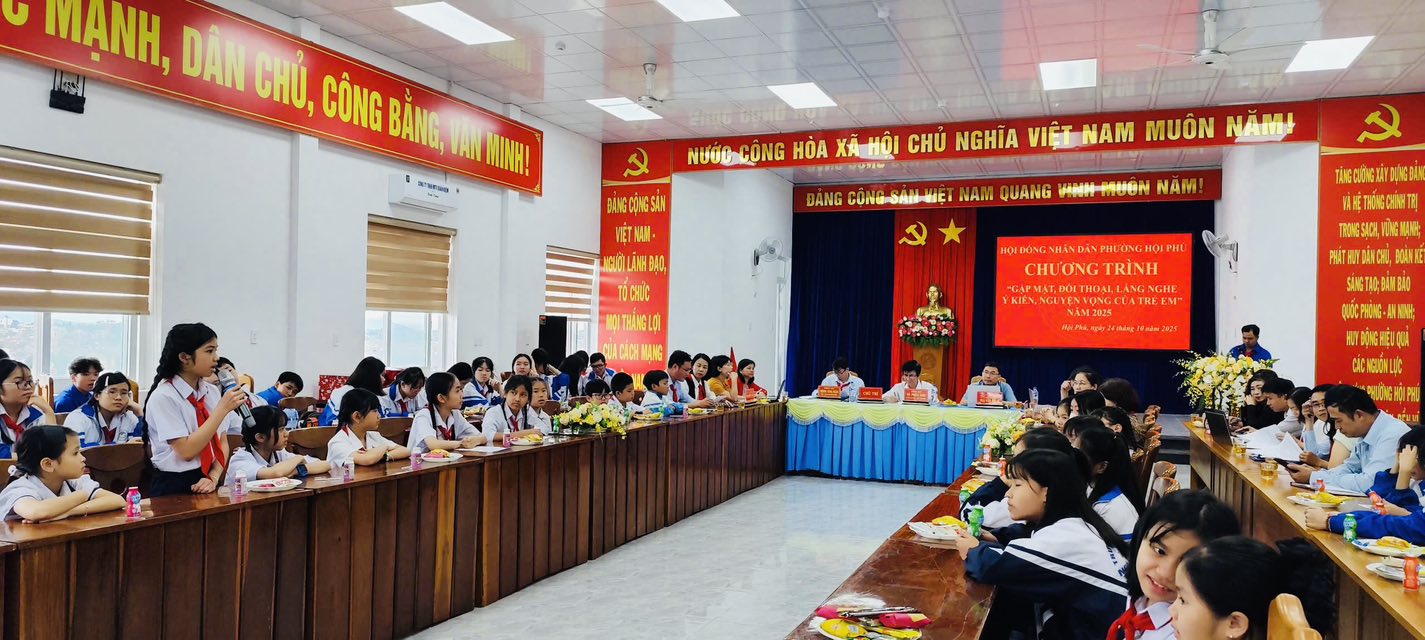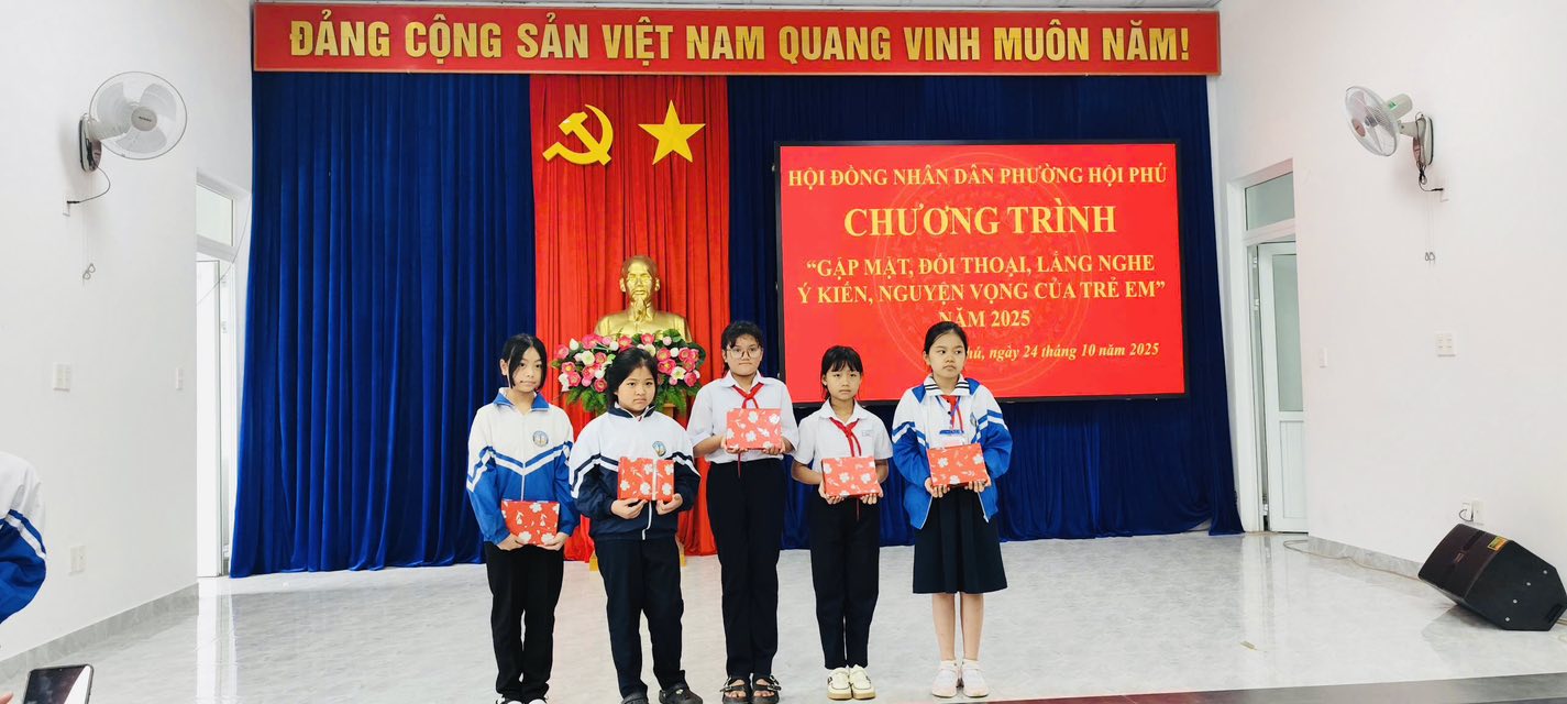 Ngày 24/10/2025, HĐND phường Hội Phú tổ chức Chương trình gặp mặt, đối thoại, lắng nghe ý kiến nguyện vọng của trẻ em năm 2025. Tham dự chương trình có đồng chí: Võ Phúc Ánh - Bí thư Đảng ủy, Chủ tịch HĐND phường, đồng chí Dương Công Huân - Phó Chủ tịch HĐND phường, đồng chí Mai Văn Hoàn - Phó Chủ tịch UBND phường chủ trì Chương trình. Cùng dự còn có đại diện lãnh đạo các cơ quan tham mưu giúp việc Đảng ủy, các ban, ngành, Mặt trận và các tổ chức chính trị - xã hội phường; Ban giám hiệu các trường học trên địa bàn và sự có mặt của 70 em học sinh đại diện cho hơn 7.000 thanh thiếu niên học sinh.