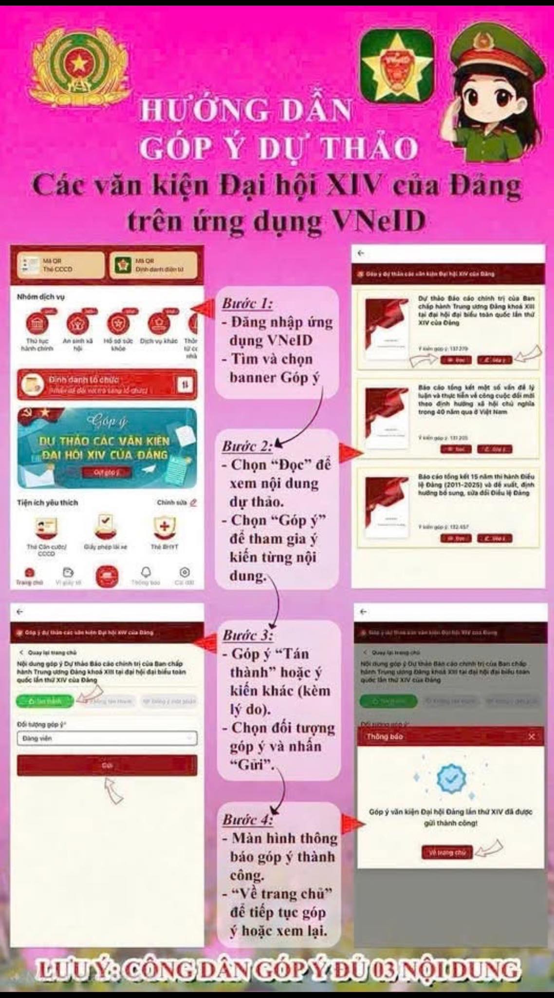 Cán bộ, đảng viên và Nhân dân có thể truy cập ứng dụng VNeID, chọn mục “Góp ý Văn kiện Đại hội XIV của Đảng” để gửi ý kiến trực tiếp, nhanh chóng và thuận tiện.