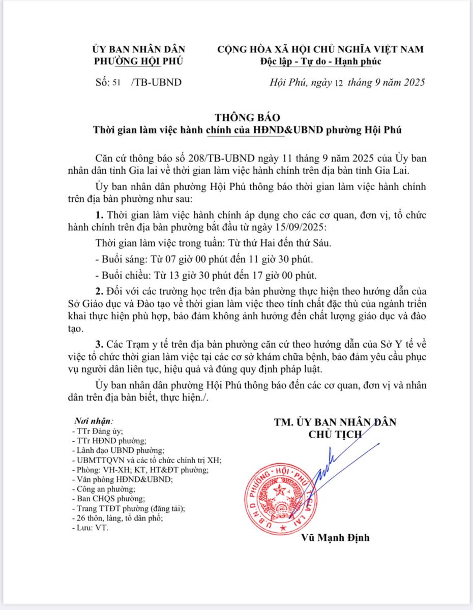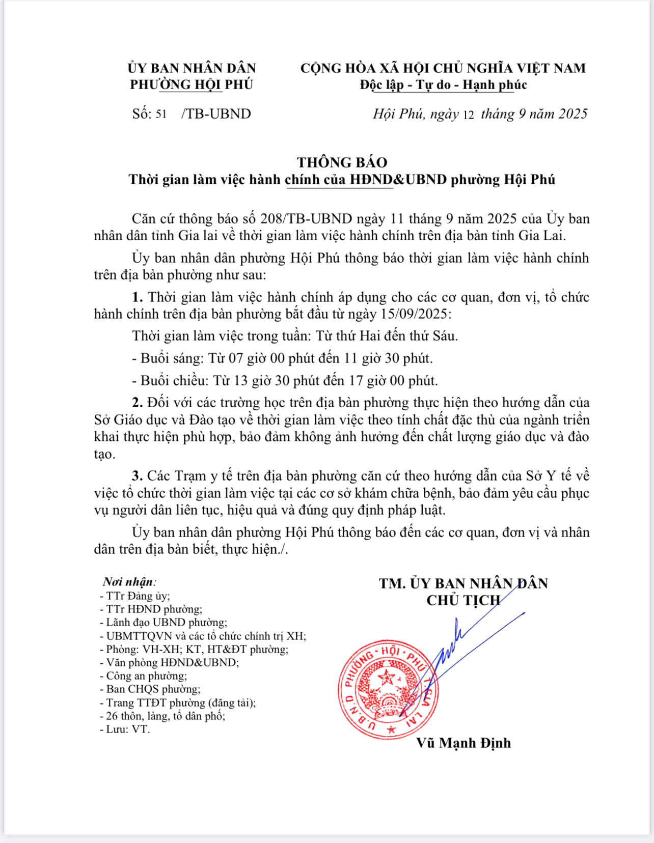 Thứ sáu, 12/09/2025 | 23:07 A- A A+ | Thông báo thời gian làm việc hành chính của HĐND&UBND phường Hội Phú Chia sẻ Đọc bài Lưu