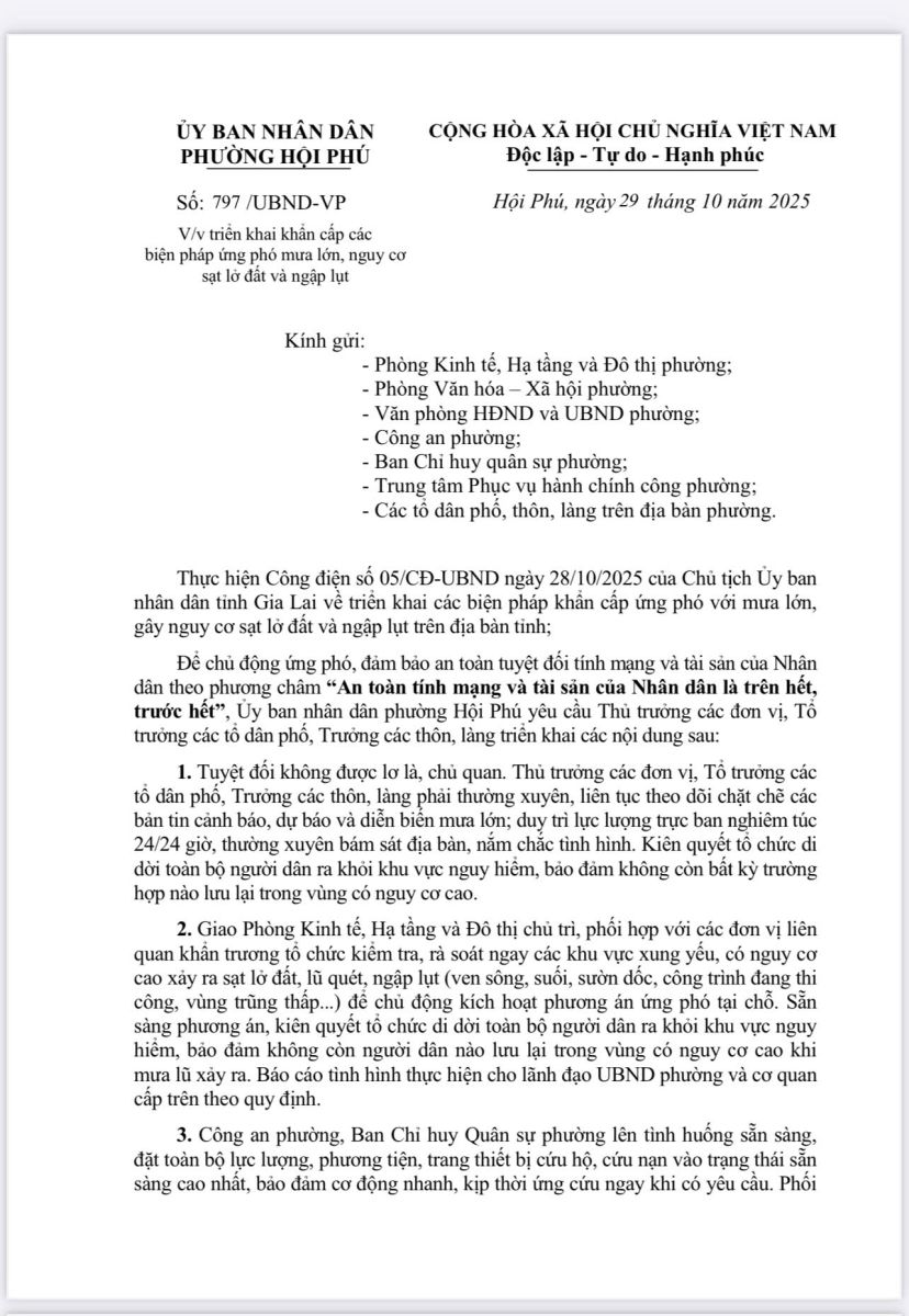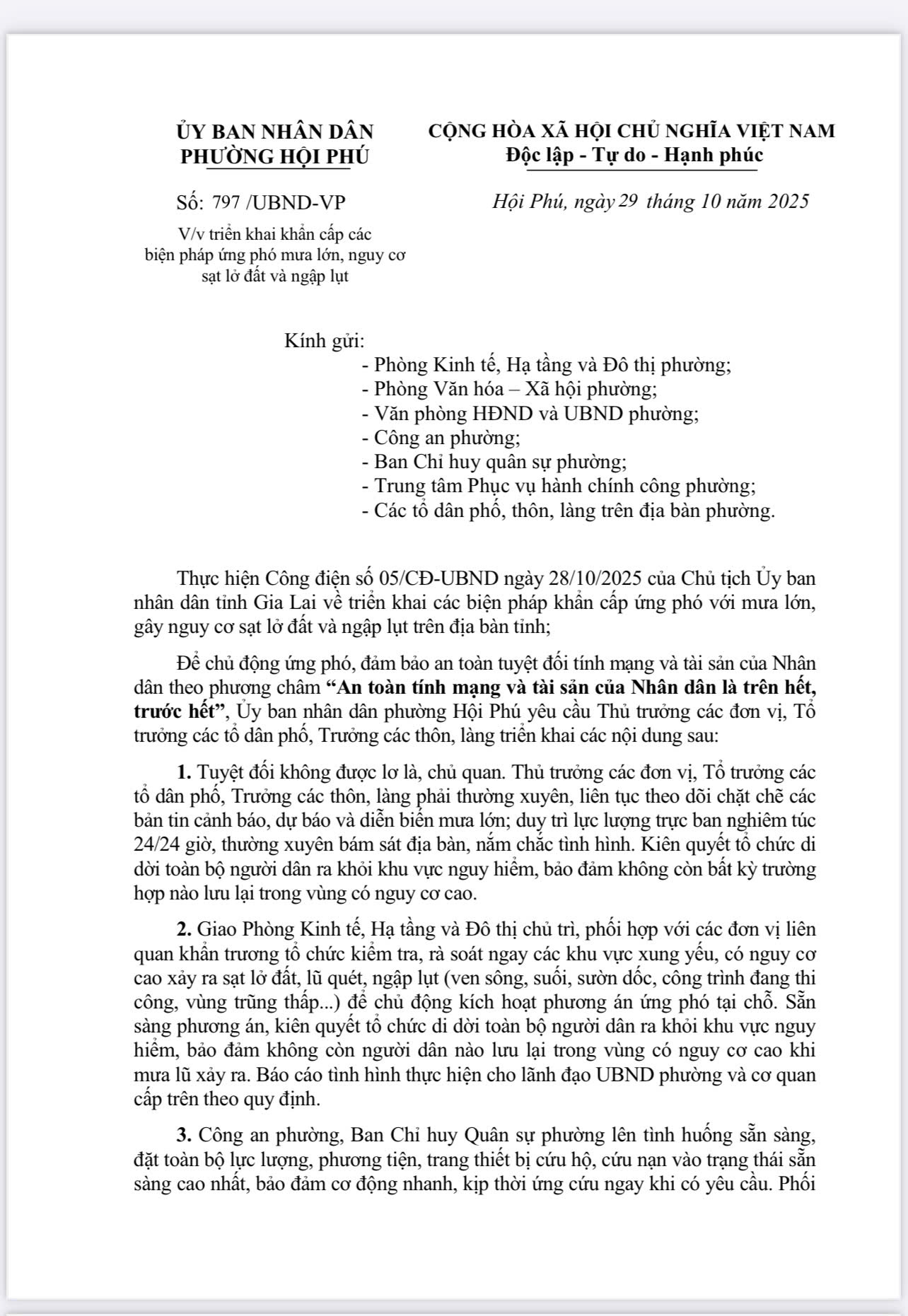 Thứ tư, 29/10/2025 | 13:48 A- A A+ | V/v triển khai khẩn cấp các biện pháp ứng phó mưa lớn, nguy cơ sạt lở đất và ngập lụt Chia sẻ Đọc bài Lưu