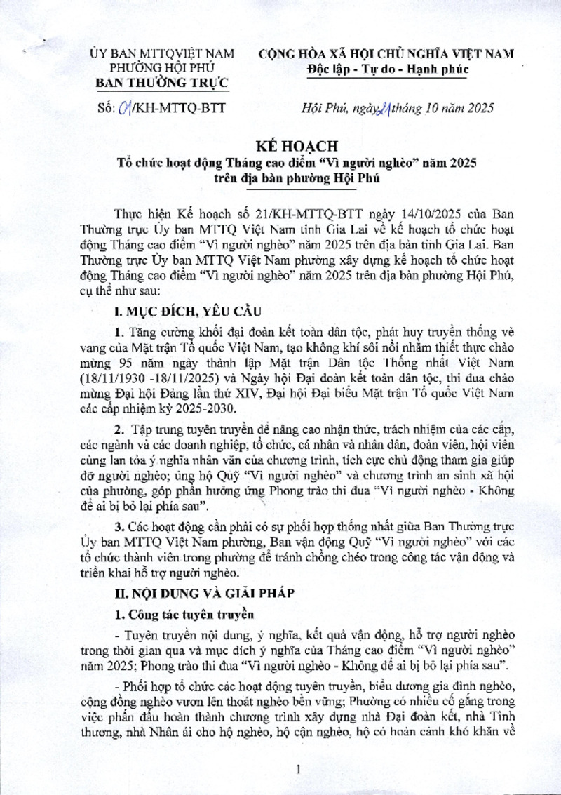 | Tiêu đề văn bản | Kế hoạch tổ chức hoạt động Tháng cao điểm “Vì người nghèo” năm 2025 trên địa bàn phường Hội Phú | ||