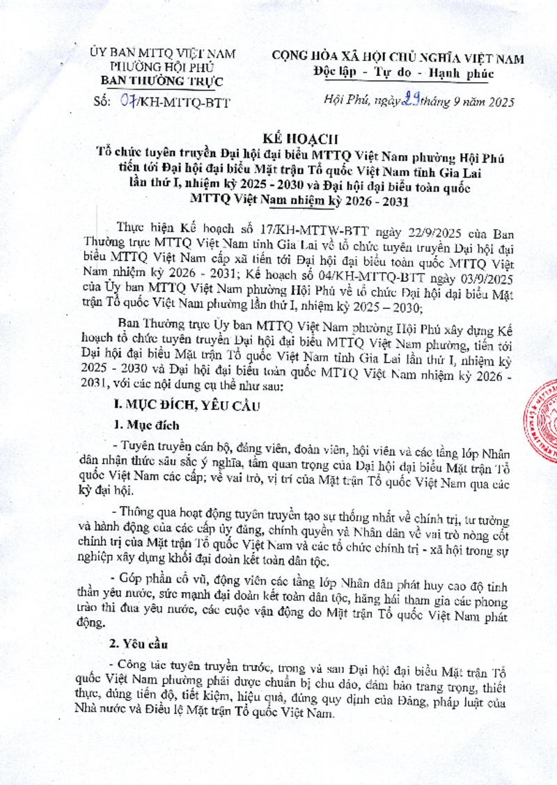 | Tiêu đề văn bản | Kế hoạch Tổ chức tuyên truyền Đại hội đại biểu MTTQ Việt Nam phường Hội Phú tiến tới Đại hội đại biểu Mặt trận Tổ quốc Việt Nam tỉnh Gia Lai lần thứ I, nhiệm kỳ 2025 - 2030 và Đại hội đại biểu toàn quốc MTTQ Việt Nam nhiệm kỳ 2026 - 2031 | ||