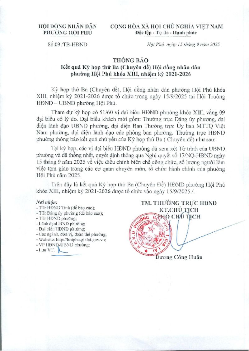 Thông báo kết quả kỳ họp thứ 3 ( chuyên đề) HĐND phường Hội Phú khóa XIII, nhiệm kỳ 2021 - 2026 23/09/2025, 14:54:13 - Lượt xem: 5 Tweet Thêm vào danh sách Báo xấu Thông tin tài liệu Thông báo kết quả kỳ họp thứ 3 ( chuyên đề) HĐND phường Hội Phú khóa XIII, nhiệm kỳ 2021 - 2026