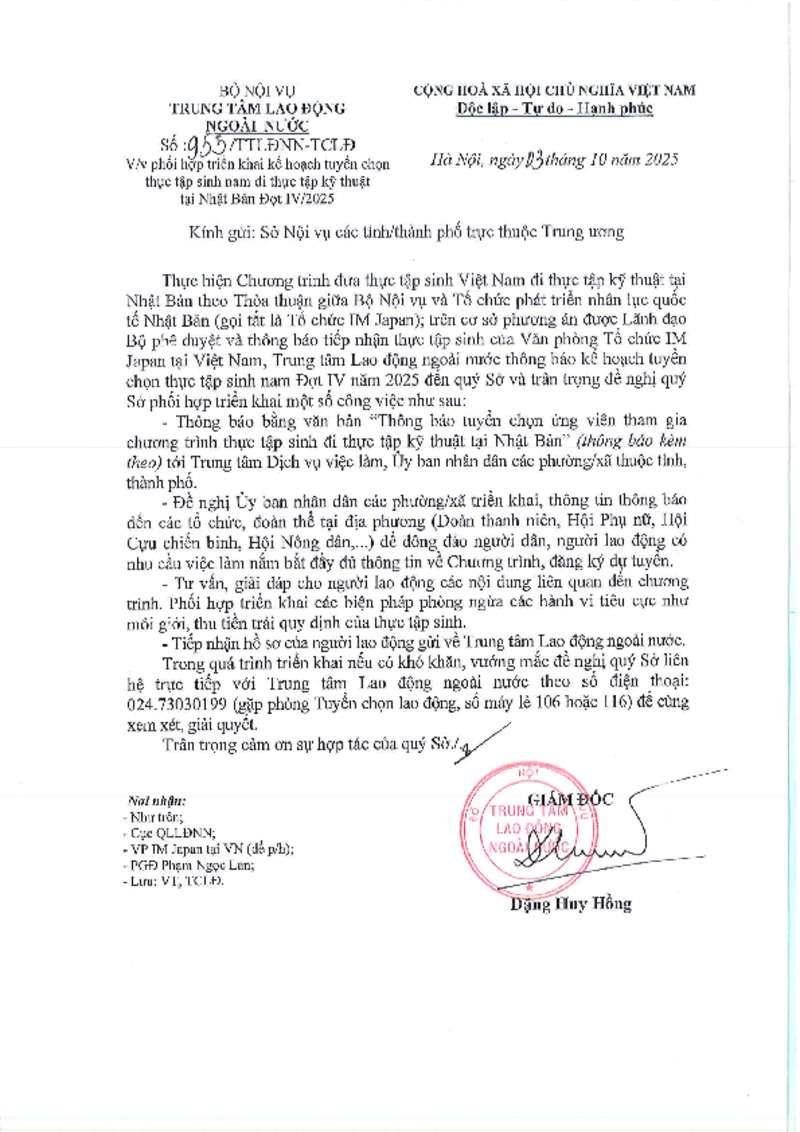 Thông báo tuyển chọn thực tập sinh đi thực tập kỹ thuật tại Nhật Bản theo Chương trình IM Japan 14/10/2025, 11:25:27 - Lượt xem: 0 Tweet Thêm vào danh sách Báo xấu Thông tin tài liệu Thông báo tuyển chọn thực tập sinh đi thực tập kỹ thuật tại Nhật Bản theo Chương trình IM Japan
