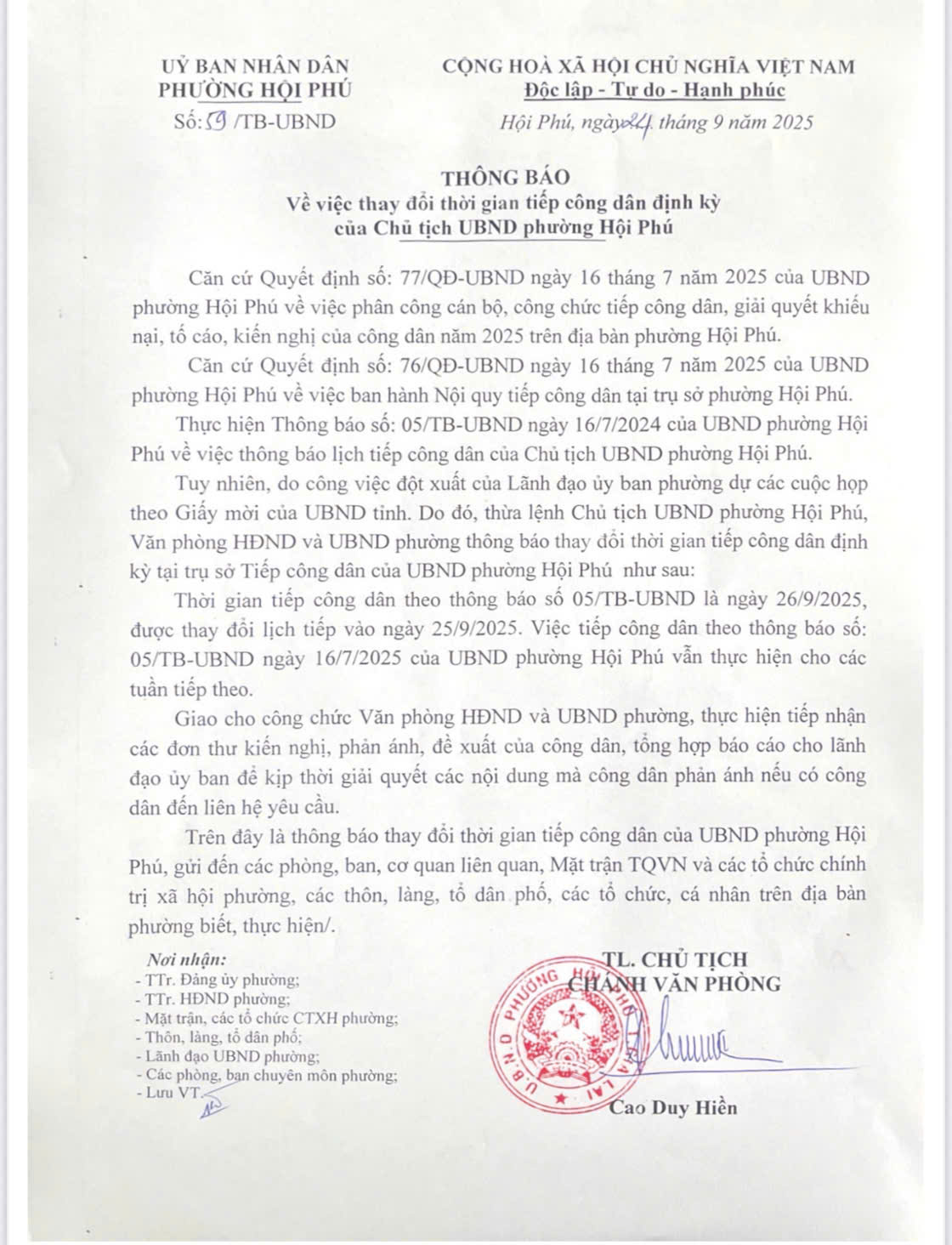 Thứ tư, 24/09/2025 | 10:10 A- A A+ | Thông báo thay đổi thời gian tiếp công dân định kỳ của Chủ tịch UBND phường Hội Phú Chia sẻ Đọc bài Lưu Thông báo thay đổi thời gian tiếp công dân định kỳ của Chủ tịch UBND phường Hội Phú Tập tin đính kèm Trình duyệt không hỗ trợ iframe.