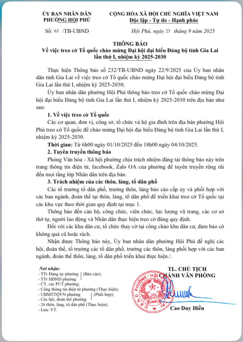 Thứ ba, 23/09/2025 | 15:33 A- A A+ | Thông báo treo cờ tổ quốc chào mừng Đại hội đại biểu Đảng bộ tỉnh lần thứ I, nhiệm kỳ 2025 - 2030 và Đại hội đại biểu toàn quốc lần thứ XIV của Đảng Chia sẻ Đọc bài Lưu