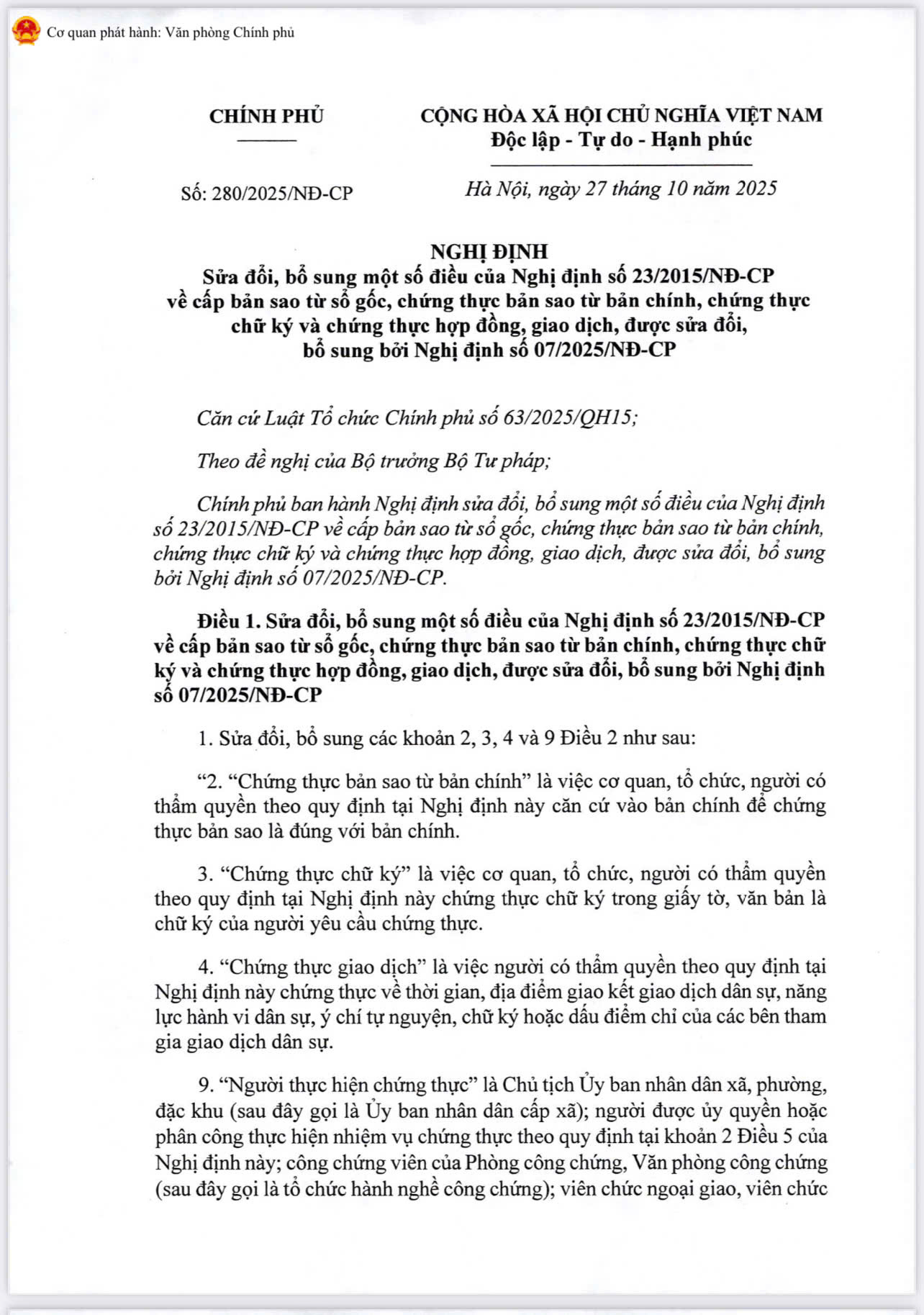 về việc triển khai thực hiện Nghị định số 280/2025/NĐ-CP ngày 27 tháng 10 năm 2025 của Chính phủ sửa đổi, bổ sung một số điều của Nghị định số 23/2015/NĐ-CP về cấp bản sao từ sổ gốc, chứng thực bản sao từ bản chính, chứng thực chữ ký và chứng thực hợp đồng, giao dịch
