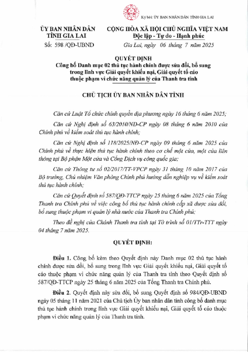 Quyết định công bố 2 danh mục thủ tục hành chính được sửa đổi bổ sung về lĩnh vực giải quyết khiếu nại, giải quyết tố cáo thuộc phạm vi của Thanh tra tỉnh