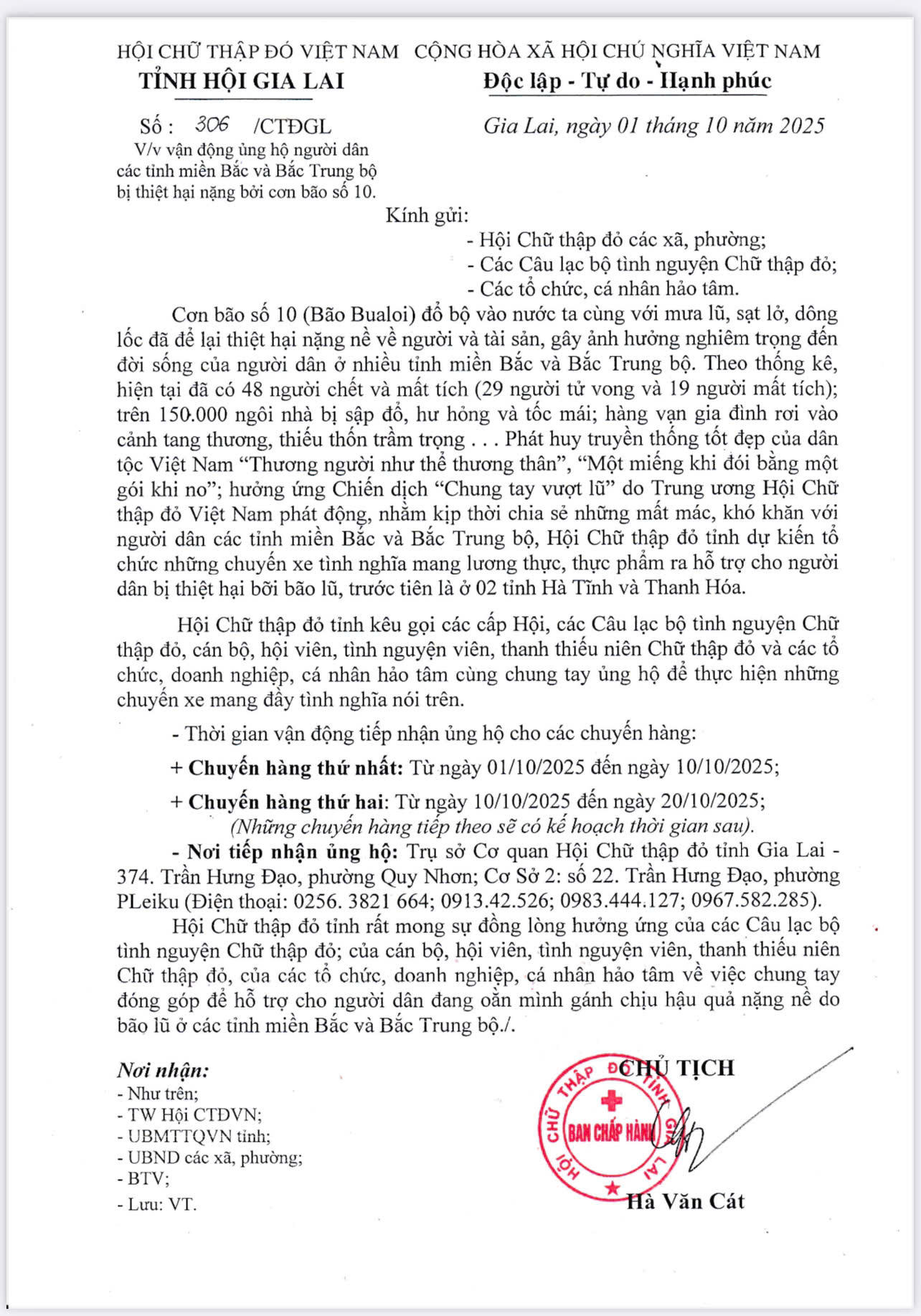 - Nơi tiếp nhận hỗ trợ: Trụ sở Hội Chữ thập đỏ tỉnh Gia Lai: 374 Trần Hưng Đạo, phường Quy Nhơn. Cơ sở 2: 22 Trần Hưng Đạo, phường Pleiku.