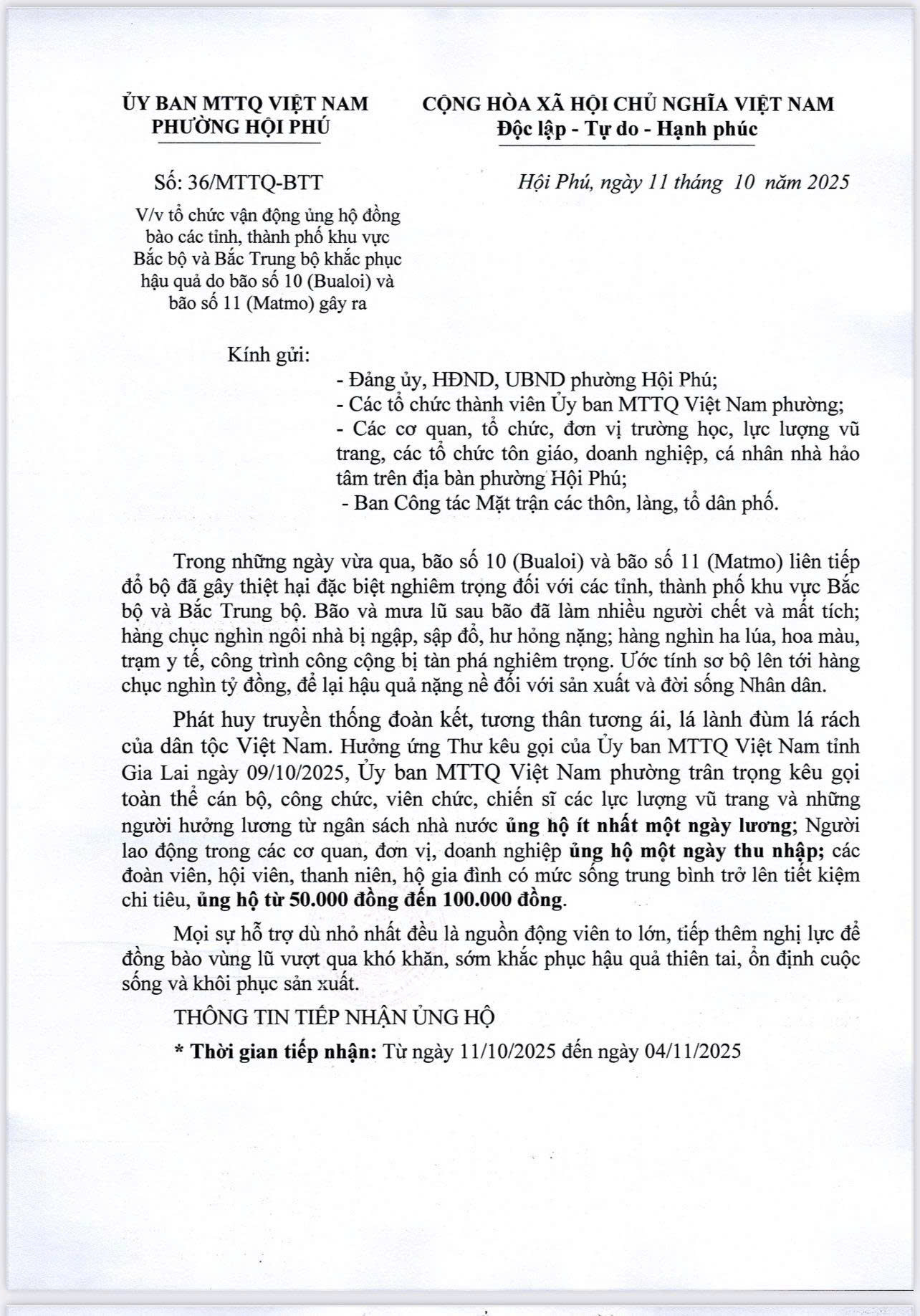 Phát huy truyền thống đoàn kết, tương thân tương ái, lá lành đùm lá rách của dân tộc Việt Nam. Hưởng ứng Thư kêu gọi của Ủy ban MTTQ Việt Nam tỉnh Gia Lai ngày 09/10/2025, Ủy ban MTTQ Việt Nam phường trân trọng kêu gọi toàn thể cán bộ, công chức, viên chức, chiến sĩ các lực lượng vũ trang và những người hưởng lương từ ngân sách nhà nước ủng hộ ít nhất một ngày lương; Người lao động trong các cơ quan, đơn vị, doanh nghiệp ủng hộ một ngày thu nhập; các đoàn viên, hội viên, thanh niên, hộ gia đình có mức sống trung bình trở lên tiết kiệm chi tiêu, ủng hộ từ 50.000 đồng đến 100.000 đồng. Mọi sự hỗ trợ dù nhỏ nhất đều là nguồn động viên to lớn, tiếp thêm nghị lực để đồng bào vùng lũ vượt qua khó khăn, sớm khắc phục hậu quả thiên tai, ổn định cuộc sống và khôi phục sản xuất.